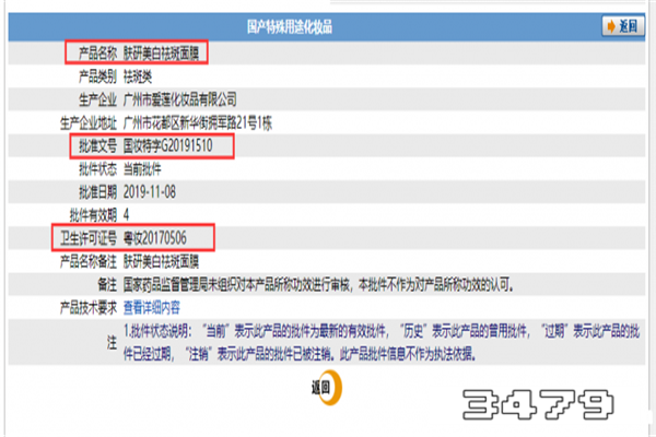 1、旗下诸多系列的面膜、眼霜等护肤品有在国家药品监督管理局备案,有相对应的批准文号。以这款为例“一枝春 玻尿酸水润滋养面膜”为例,其批准文号是“粤G妆网备字2017000413”。如图所示: