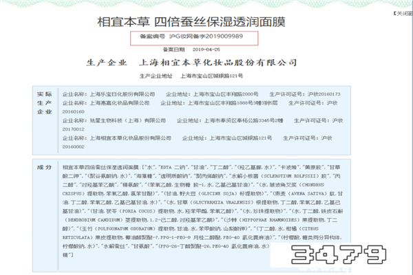 1、仙女如果有空,就会发现相宜本草旗下每款面膜宝贝详情页有批准文号。以这款“相宜本草 四倍蚕丝保湿透润面膜”为例,这款面膜的批准文号是“沪G妆网备字2019009989”以及可以在国家药品监督管理局查询相对应的备案信息。具体如图所示: