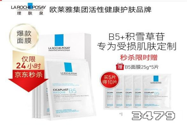 1、B5多效保湿修复面膜,含有维生素原B5、积雪草苷以及理肤泉温泉水,能有效的呵护肌肤,给肌肤补水保湿,这款面膜是专门为受损肌肤定制的,痘痘肌、敏感肌都能使用。