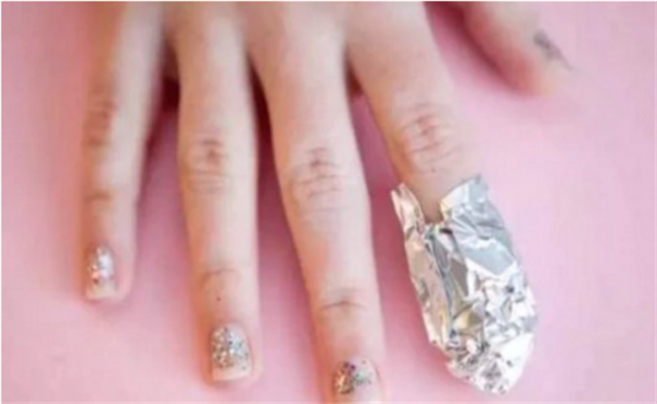 3、用锡纸把有美甲片的手指甲包裹起来,大约20分钟左右;