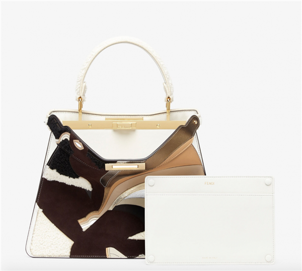 双面的设计引人注目,这款Peekaboo ISeeU Medium有着两面,一面是以雪白色为底色的素色,另一面是Antonio Lopez的Rainbow Girl画作,让你能有两种不同的使用选择,材质上选用了剪羊毛以及皮革搭配。此外,可拆卸式的纳帕皮革内袋让你更灵活运用。HK$59,800