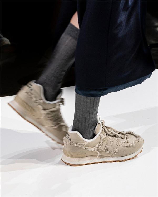 想像穿在脚上,搭配一件牛仔裤,就像上班族在早晨赶着通勤时一样...,今次Miu Miu重新构想了1980年代的经典型号New Balance 574,鞋舌上印有Miu Miu及New Balance两大品牌象徵性标誌,以牛仔布作为材质覆盖,边缘设计皆以毛边处理,刻意不修边幅的效果,不羁率性的感觉都是构造过程的一部分,正正呼应秀上Y2L千禧年代的理念。