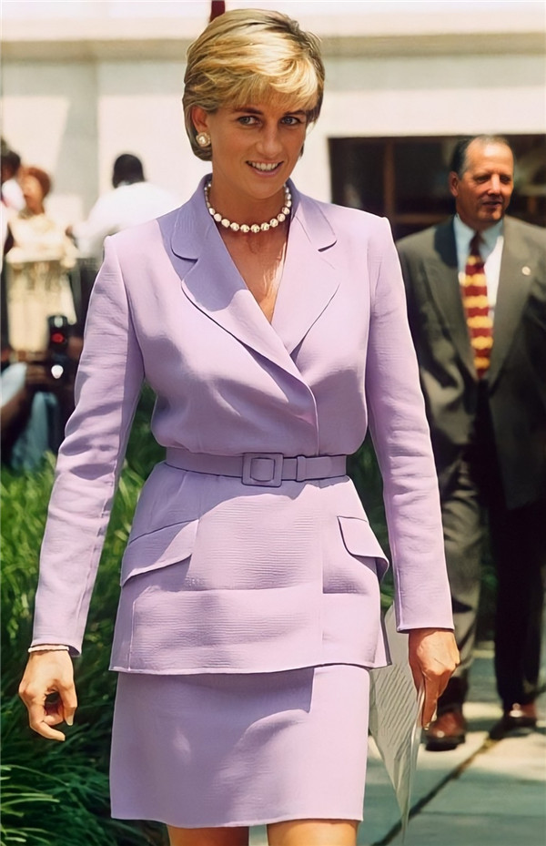另一套柔美紫色调套装也相当迷人,完美的复刻了当时戴妃身上的服装。这一套服装有着俐落的剪裁搭配着白色的Lady Dior手袋。在穿搭上以皮带繫在腰间让腰线更加明显,能拥有更好的比例。在正式的西装穿搭,不论是裙装或是裤装都能尝试这一个穿搭技巧。