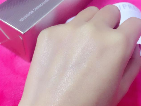 轻轻地拍打至吸收,会发现它附着在手背上非常轻薄,丝毫不会有粘稠的感觉,还会有一种淡淡地光泽感。
