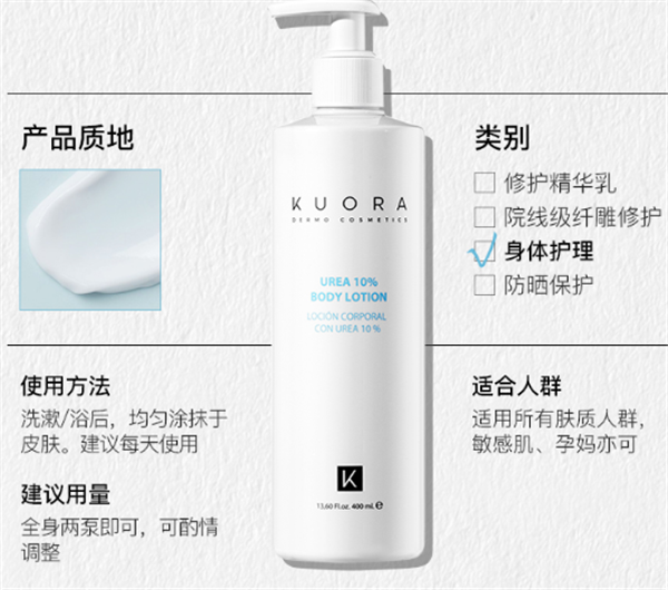 kuora尿素身体乳里面加入10%的尿素含有甘油成分,可以改善蛇皮和沙漠肌,亲测28天确实有效果,而且保湿力涂在身上**一下就吸收了不沾衣服,这款滋润度真的蛮好的,而且还能改善鸡皮肤,用后摸着不像以前一堆疙瘩的粗糙感, 小疙瘩全都在变淡变平。 另外还会抹在后脚跟这个比较粗糙的地方,感觉脚都变得嫩嫩的了。