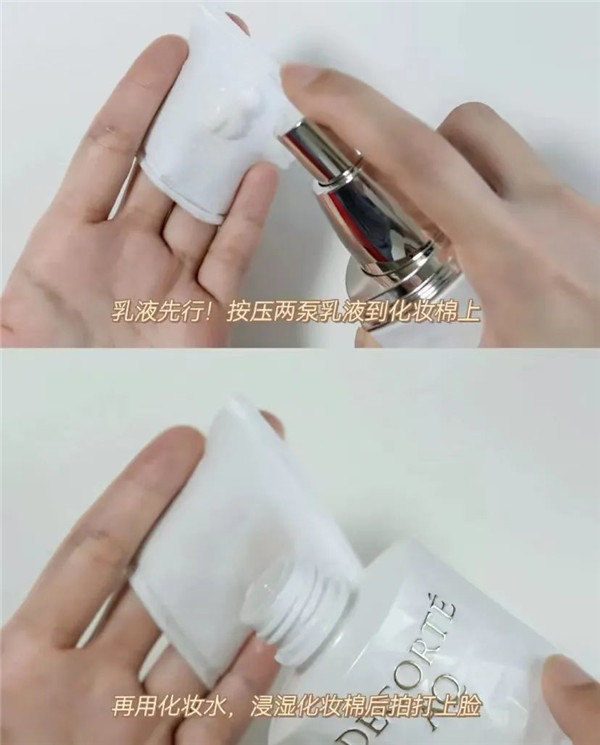 用法:先乳后水,黛珂家以渗透技术见长,就是先将乳液软化角质层,使后续的护肤品可以更好吸收,更好补给水分。要配合化妆棉一起使用。把乳液挤在化妆棉上,按两次的用量,擦完乳液再用化妆水,同样需要倒在化妆棉上使用,以轻拍方式融合于肌肤