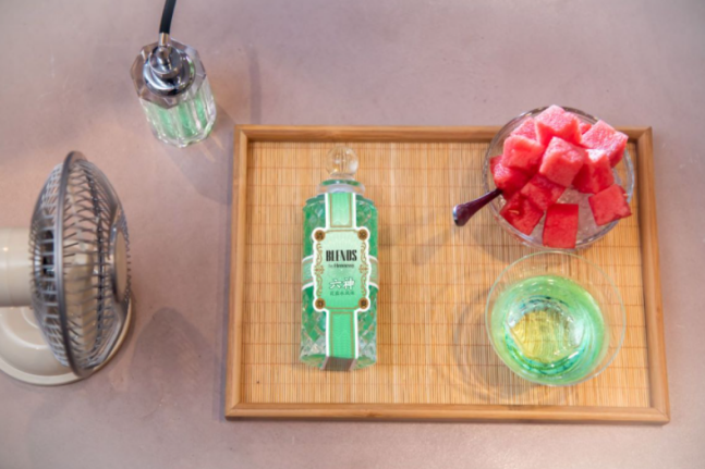 这两个看起来毫无关系的品牌相互作用,却在一起迸发出了奇妙的化学反应。限时供应的BLENDS by Hennessy ×六神鸡尾酒套装——“六神有主”,其中包含旧风扇、冰镇西瓜以及这一瓶花露水风味的特调。特调以薄荷的清新微辛与花香的淡雅交织,融入轩尼诗V.S.O.P馥郁芬芳,刚一入口略有辛辣苦涩,但回味却带有一股独特的清香,创新还原六神凉感,带顾客重温六神花露水香气。