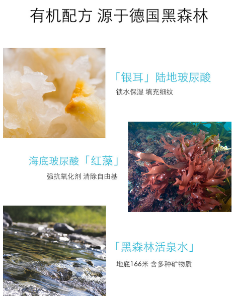 其中比较有代表性的,当属「玻尿酸保湿锁水精华原液」(又称“双层玻尿酸精华”),它所采用的正是来自古老德国黑森林地下166米的活泉水,矿物成分更多,水质更纯净,含氧量更充足,并且是自然纯净有机。