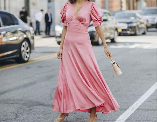 粉**嫩的颜色,最是少女心了。如果是一个甜美的姑娘,当然可以大胆的选择这种稚嫩又清新的粉色系了。浅粉色甜美大方,真丝的面料更是轻盈柔和。这种自然的V领加上修身的上身元素,更是勾勒出高挑的腰身,窈窕的身段令人着迷。泡泡袖的风格,也是洋气而大方。点缀了**浪的裙摆,也是呈现出高级时髦的气质。