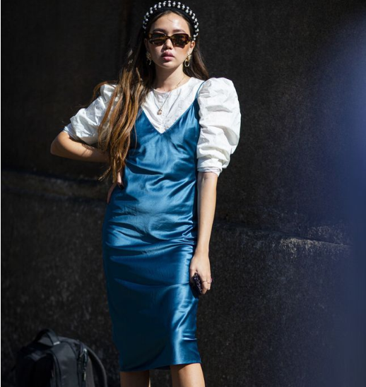 宝蓝色的颜色,是一种相对更加华丽高级的颜色,穿起来更显得高级靓丽。而且像这种亮度非常高的颜色,更适合一些冷白皮的姑娘。如果肤色暗沉的话,很容易显得肌肤更加黯淡无光。所以当我们选择连衣裙的时候,还是要多参考自己的肤色,来选择适合自己的色系。宝蓝色吊带裙,搭配了泡泡袖衬衫,也是甜美又冷艳的。