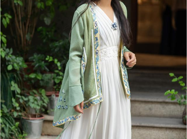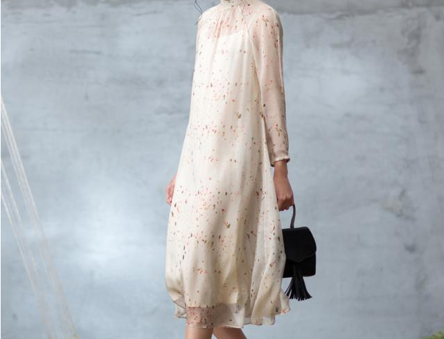 这款白色的真丝连衣裙,前胸与袖口具有中国分的图案设计,让整件裙子非常的有东方韵味。立领设计非常复古,飘逸的裙摆,仙气十足。但是整件真丝,尤其是桑蚕丝的裙子价格都比较贵,参考价都在800-1000+元。
