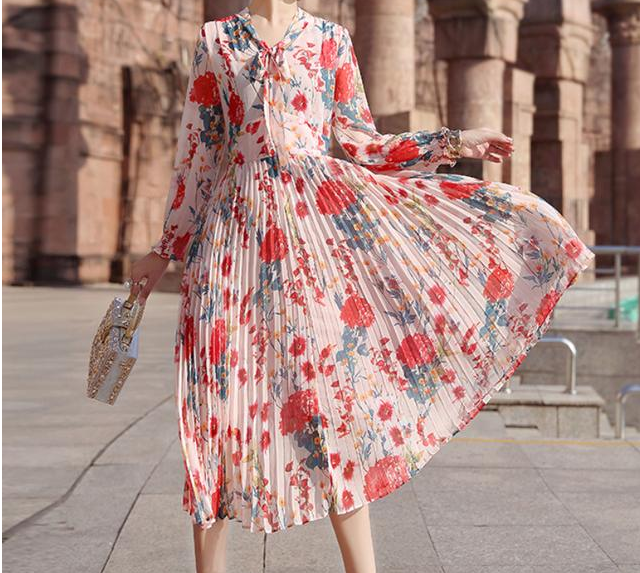 真丝印花百褶连衣裙: