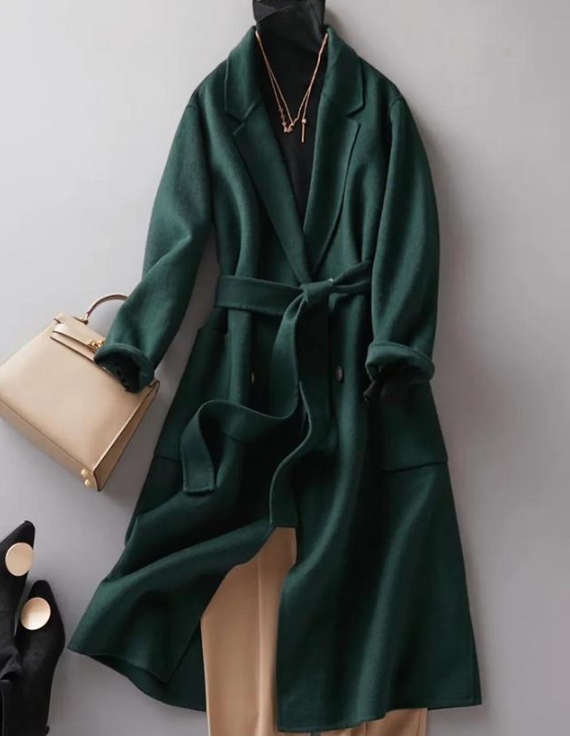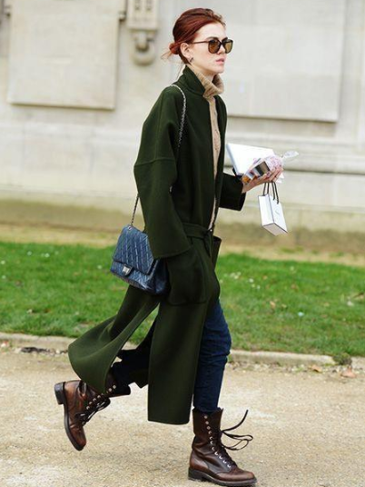 冷暖色系的搭配,杏色的长裤搭上墨绿色的外套,养眼又好看。