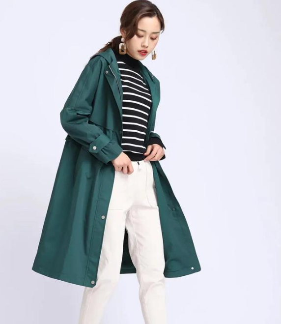 经典的海魂衫,配上白色长裤和墨绿色的风衣,法式风情的演绎,是永不过时的极简装扮。