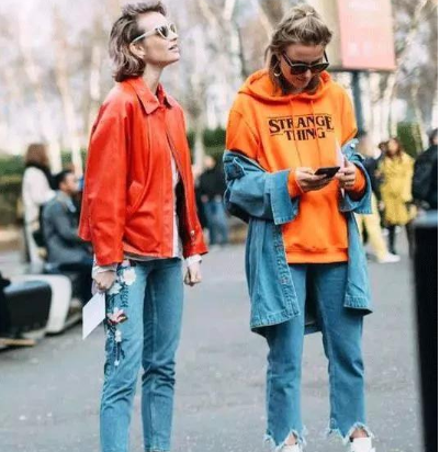 蓝色为冷色,橙色与蓝色可以形成强烈的对比,是比较经典的撞色搭配,让搭配更显眼,画面也更有活力感。橙色西装外套或夹克搭配蓝色九分牛仔裤,呈现出一种很清新时尚的感觉。