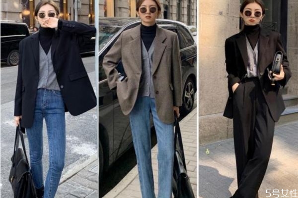 天气更冷一点的时候,我们就可以更尽情地玩转叠穿了。如果黑色高领毛衣搭配西装外套已经不能够抵御寒冷,那么就多叠加一件灰色羊毛针织“奶奶衫”吧!不仅可以保暖,还可以带出层次感,让你的穿搭更时尚。“高级灰”并非浪得虚名,和黑色高领毛衣搭配,既低调又高级。因为“奶奶开衫”显得比较老气,所以搭西装外套的时候,下半身的衣物不妨选择随性休闲的蓝色牛仔裤来搭配,因为牛仔的不羁与洒脱可以中和奶奶衫的老气。像这位博主小姐姐的搭配就是最好的示范,宽松的西装外套内搭黑色半高领打底衫和灰色针织开衫,再加上一对短靴,看上去就会更潇洒帅气,非常有潮范儿。