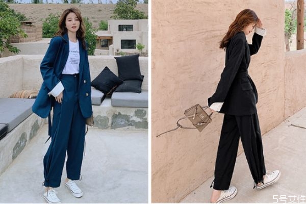 如果喜欢简约帅气的休闲风格穿搭,可以选择简单的黑色或者白色T恤作为内搭。纯色T恤百搭好穿,搭配时在配色上注意一下就行。比如黑色T恤搭配黑色宽松西装外套,或者黑白字母T恤搭配细格纹的复古双排扣西装都是不错的选择。下装的颜色可以选择同色系的黑色皮质半身裙,又或者深灰色阔腿裤。而为了和T恤的休闲风相呼应,鞋子的风格也应该选择休闲舒适的小白鞋或者帆布鞋,整体搭配才会在风格上达成一致。