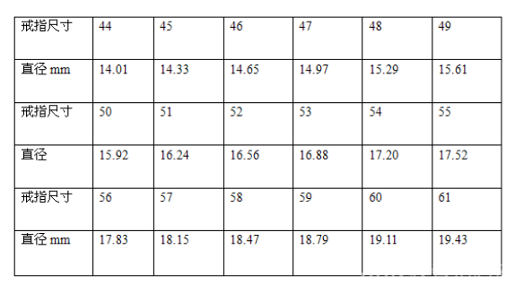 在不清楚自己平常佩戴戒指尺寸的情况下,可以根据自身手指的直径长度,对照出戒指尺寸。这种戒指尺寸对照方式,首先需要清楚自身手指直径,手指直径的测量方法为:用卡尺,直接测量手指直径;或将直尺放在自己的手指上,轻微下压,用硬纸板在直尺下方比对出直径大小。