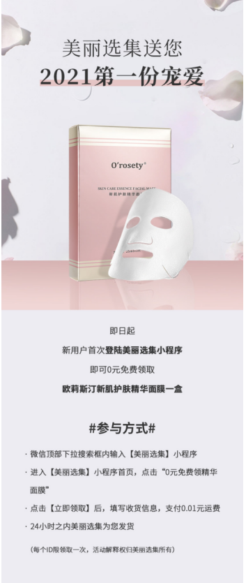 除此之外,美丽选集为了造福广大爱美用户,贴心为大家带来0元免费领取O'rosety欧莉斯汀新肌护肤精华面膜的福利活动。O'rosety欧莉斯汀作为美丽选集旗下自主品牌,经过2年精心研发,和多轮预约内测,其新肌护肤精华面膜收获用户好评如潮。而本次上新的O'rosety欧莉斯汀新肌护肤精华面膜在成分功效上更是进行了全面升级,主打三大神仙成分:清酒酵母菌、水光钛、乙酰葡糖胺,满足补水、美白、修复等多种肌肤需求。