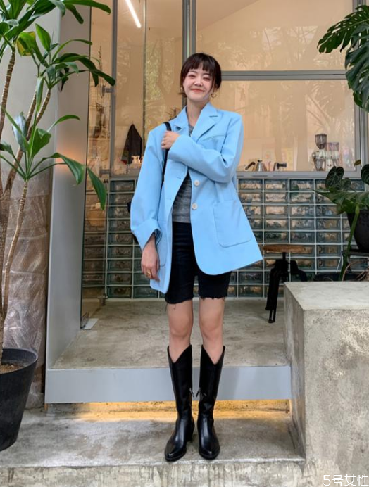 想要打造酷帅风look,就该去选择帅气有型的中性风上衣,比如西装、衬衫、皮衣。pick一款蓝色西装,搭配上骑行裤和骑士靴,帅气利落,时髦有范。