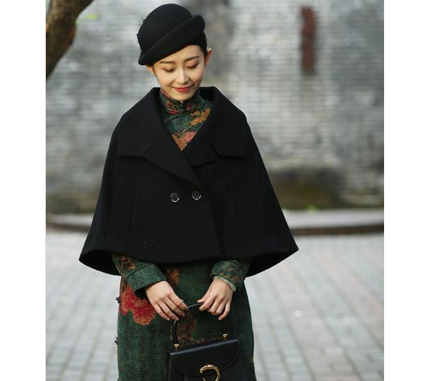 秋冬季节天气寒冷,单穿一件旗袍显然是不实际的事情,不能只要风度不要温度,毕竟身体是革命的本钱,健康才是最重要的事情。充满古风韵味的斗篷短披风无疑是冬季穿搭的时尚单品之一,黑色的毛呢披风时尚又百搭,挺括的西式大翻领简洁大气,适合日常穿着,实用性非常强。中西合璧的设计温婉又洋气,无袖的斗篷宽松方便,不限制穿着者的活动,内有绑带固定,防止披肩乱窜,破坏造型的完整性,好看又实用。
