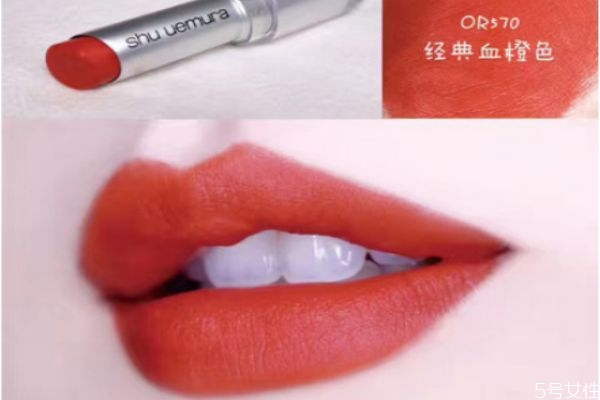 口红颜色一定要选适合自己的,口红的颜色有很多种,不同的口红颜色涂出来的效果不同,植村秀570是很火的一个色号,植村秀570是很显眼的血橙色。