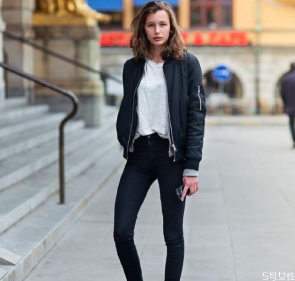 黑色紧身裤搭飞行员夹克是最简易好看的搭配。飞行员夹克带有蓬的感觉,所以下半身穿一条紧身裤,就会比较显瘦,突出飞行员夹克的英挺帅气。