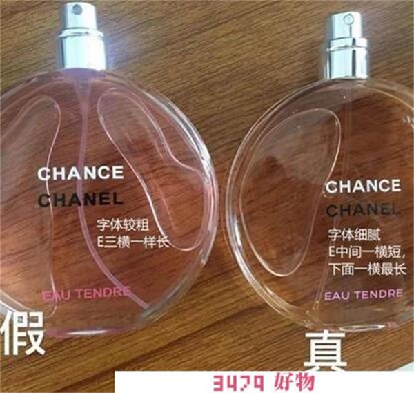 正品瓶身字体细末。“E”中间的一横偏短,下面一横比较长。假货字体比较粗,“E”三横是一模一样长。