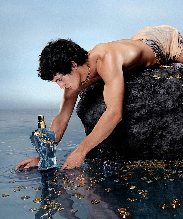 香水瓶身映射了这款香水的性格:雕塑般的男性躯干装饰着金色丝巾与一颗蓝色宝石,内含淡蓝色香水。它被盛装在一个带有金色细节的优雅蓝色金属罐中,进一步强化了其奢华的特质。