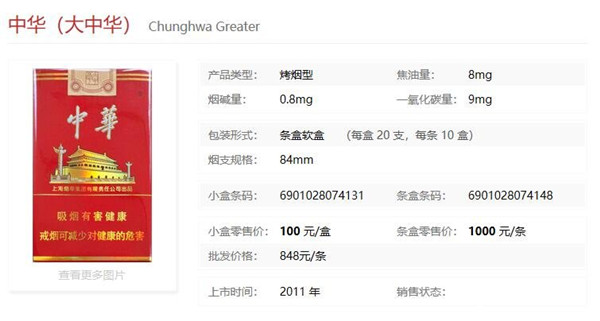 首先要说明一点的是,中华到目前为止,没有100一条的香烟,但有100一盒的大中华款式香烟,香烟具体信息如下图: