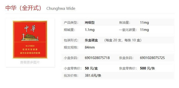 除此之外,中华还有一款全开式,扁盒香烟,价格在50左右,具体信息如下: