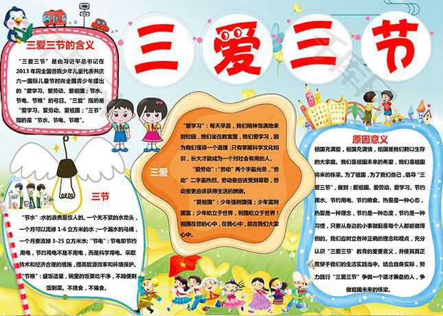 4、我们应树立各种正确的理念和观点,充分认识“三爱三节’教育的重要意义,并使其真正贯穿于我们的生活实践当中。从具体的事情抓起,持之以恒做到“三爱三节”,做好“三爱三节”,宣传“三爱三节”。结合自身实际,努力践行“三爱三节”争做一个德才兼备的人,争做祖国未来的栋梁。