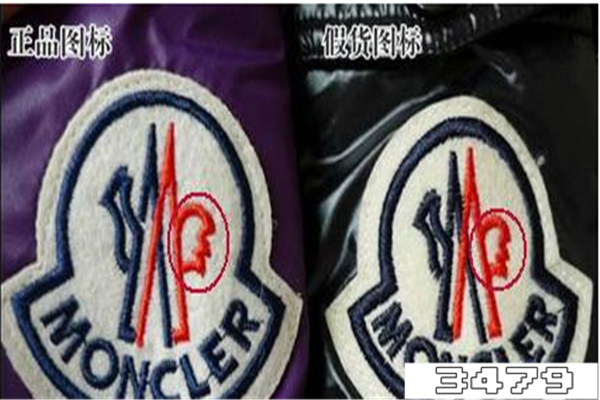 如图所示,蒙口羽绒服的商标绣线很精细,而假货的绣线有些粗糙,太难的针脚有带空隙的地方。